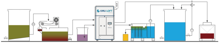 左から 廃液タンク ・ ベルトフィルター ・ 洗浄剤 ・ エバポレーター ・ オイルセパレーター ・ 再生水タンク ・ 濃縮液タンク